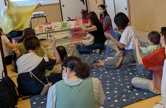 お子さまの年齢差はありましたが、会が始まると手遊び、絵本を眼を輝かせて、それぞれ親子の触れ合いを楽しんでいました。